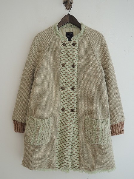 デザイン:mina perhonen「sherbet」のニットダウンコートです。カラーはブラウンベージュ×くすんだ薄緑系で、ダウン&フェザー入りのニット地であしらわれております。ダブルボタン開閉で、両腰にパッチポケット付きです。(掲載写真は、実商品のカラーにできるだけ近づけるよう努力はしておりますが、お使いのモニターや画面設定等によっては、色が異なって見える場合もございますので、予めご了承下さい)