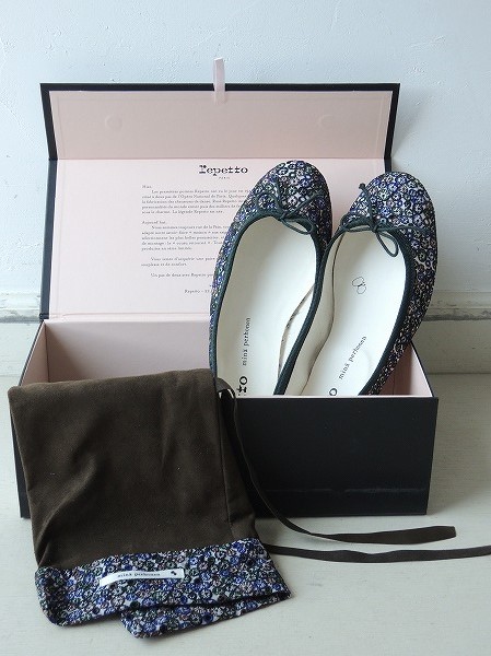 デザイン:2013年 mina perhonen×repettoのバレエシューズシューズです。カラーはオフホワイト地にグリーン・ブルー・ブラウン・ブラックの刺繍が一面に施されたデザインで、パイピングは深いグリーンです。甲部分に小さなリボンがあしらわれています。定価は¥31500です。