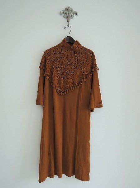 デザイン:mina perhonen 「folk」のニットワンピースです。カラーはブラウンで、やや薄手のニット素材です。フロント左にあるループボタンで着脱し、ケープをあしらったように透かし編みが施され、袖口はロールアップ可能です。裏地などはございません。 (掲載写真は、実商品のカラーにできるだけ近づけるよう努力はしておりますが、お使いのモニターや画面設定等によっては、色が異なって見える場合もございますので、予めご了承下さい)
