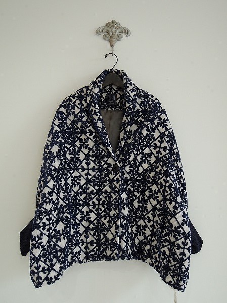 デザイン:mina perhonen 「kaleidoscope」のジャケットです。カラーはオフホワイトのパイル地ベースに、ネイビーのベロア生地の刺繍であしらわれています。袖はリブに切替えられ、フロントはボタン開閉で、裏地付きです。定価94,500円の商品です。 (掲載写真は、実商品のカラーにできるだけ近づけるよう努力はしておりますが、お使いのモニターや画面設定等によっては、色が異なって見える場合もございますので、予めご了承下さい)