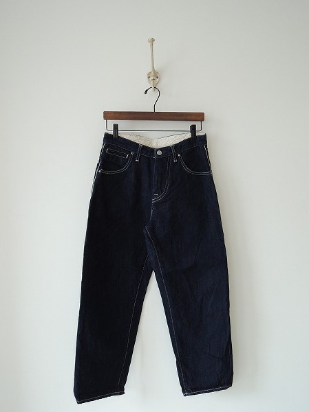 デザイン:mina perhonen「always」のデニムパンツです。カラーはインディゴネイビーで、5ポケットです。フロントはボタンでの開閉になっており、ウエスト内側の当て布は「mermaid」を使用しています。(掲載写真は、実商品のカラーにできるだけ近づけるよう努力はしておりますが、お使いのモニターや画面設定等によっては、色が異なって見える場合もございますので、予めご了承下さい)