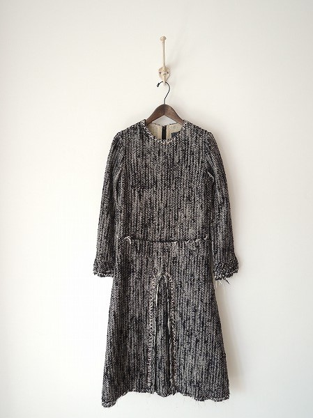 デザイン:mina perhonen 「mica」のツイードワンピースです。カラーはブラック×薄いグレー×光沢のあるオフホワイトで、やや厚手のファンシーヤーンクロス素材です。綿チュールの裏地付きで、後ジッパーでの開閉です。ネックやプリーツ部にクロスステッチがあしらわれ、裾や袖口などは裁ち切りで施されております。 (掲載写真は、実商品のカラーにできるだけ近づけるよう努力はしておりますが、お使いのモニターや画面設定等によっては、色が異なって見える場合もございますので、予めご了承下さい)