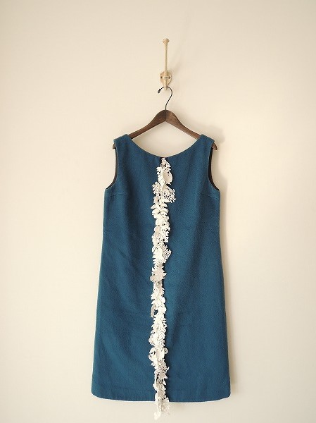 デザイン:mina perhonen 「forest parade」のワンピースです。カラーはくすんだブルー×ホワイトで、少し毛羽立ち感のあるベルベット素材です。後のフック&ジッパーでの開閉で、裏地付きです。鳥、花、蝶、文字などのモチーフ刺繍があしらわれ、裾サイドのスリットは6.5cm程ございます。定価は77,700円の商品です。 (掲載写真は、実商品のカラーにできるだけ近づけるよう努力はしておりますが、お使いのモニターや画面設定等によっては、色が異なって見える場合もございますので、予めご了承下さい)