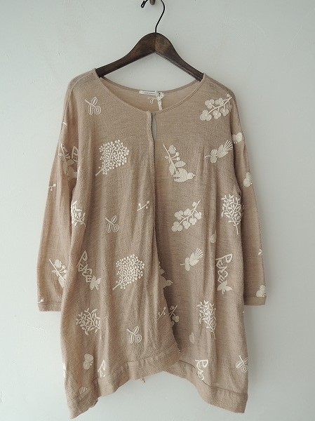 デザイン:mina perhonen 「forest parade」のカーディガンです。カラーはピンクベージュで、フロントはスナップボタンで着脱できます。全体に花や鳥の刺繍があしらわれ、後ろ裾のみひもが通っています。定価は39,900円の商品です。(掲載写真は、実商品のカラーにできるだけ近づけるよう努力はしておりますが、お使いのモニターや画面設定等によっては、色が異なって見える場合もございますので、予めご了承下さい)