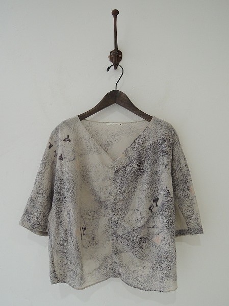 デザイン:mina perhonen「spray」の総柄プルオーバーです。カラーはグレー地にネイビー&ピンクのスプレー風プリントで、やや透け感のある薄手生地であしらわれております。 (掲載写真は、実商品のカラーにできるだけ近づけるよう努力はしておりますが、お使いのモニターや画面設定等によっては、色が異なって見える場合もございますので、予めご了承下さい)