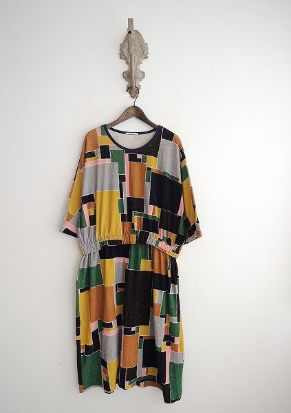 デザイン:mina perhonen 「landscape」の総柄ワンピースです。カラーはグリーン×ピンク×マスタード×ブラウン×グレー×ネイビーなどの総柄で、パイル素材であしらわれ、ウエスト部分にはゴムが通っています。 (掲載写真は、実商品のカラーにできるだけ近づけるよう努力はしておりますが、お使いのモニターや画面設定等によっては、色が異なって見える場合もございますので、予めご了承下さい)