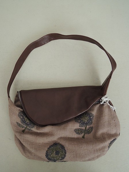 デザイン:mina perhonenのchumシリーズのショルダーバッグです。カラーはココアブラウン地にグレー・ブルーグレー・少しくすんだライトグリーンでお花の刺繍 が施されたデザインで、持ち手とバック面はブラウンのレザーです。開口部はファスナーで、内側にはダークブラウンの裏地とポケットが1つございます。素材 は表生地は絹100%、刺繍部分が綿76%、レーヨン24%、裏生地が麻100%で、レザー部分には牛革が使用されおり、定価は44,100円です。