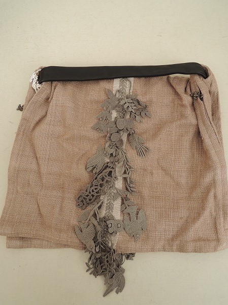 デザイン:mina perhonenのforest paradeシリーズのクラムバッグです。カラーはブラウンベージュで、中央部分にグレーのお花や小鳥、蝶々等の刺繍モチーフがあしらわれています。持ち手 はブラックのレザーで、開口部はサイドファスナーで、袋状のバッグが二枚貝の様に持ち手部分で合わせられたデザインです。裏側にポケットが1つあり、素材 は表生地が絹100%、刺繍部分が綿100%で、定価は29,400円です。