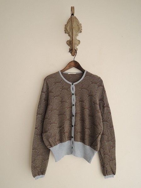 デザイン:mina perhonen 「run run run」のニットカーディガンです。カラーはブラウン×ライトブルーで、フロントと袖口ボタン開きです。(掲載写真は、実商品のカラーにできるだけ近づけるよう努力はしておりますが、お使いのモニターや画面設定等によっては、色が異なって見える場合もございますので、予めご了承下さい)