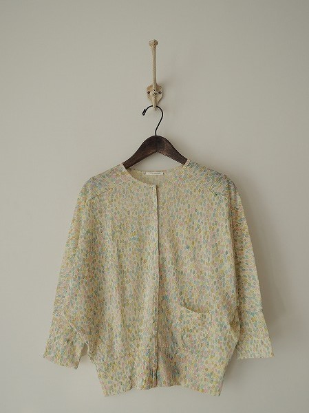 デザイン:mina perhonen 「jelly beans」のカーディガンです。アイボリーベースにパステル調のカラフルなプリントが施されたニットカットソー素材です。フロントは内スナップボタンで、左前腰辺りにはポケットがあります。(掲載写真は、実商品のカラーにできるだけ近づけるよう努力はしておりますが、お使いのモニターや画面設定等によっては、色が異なって見える場合もございますので、予めご了承下さい)
