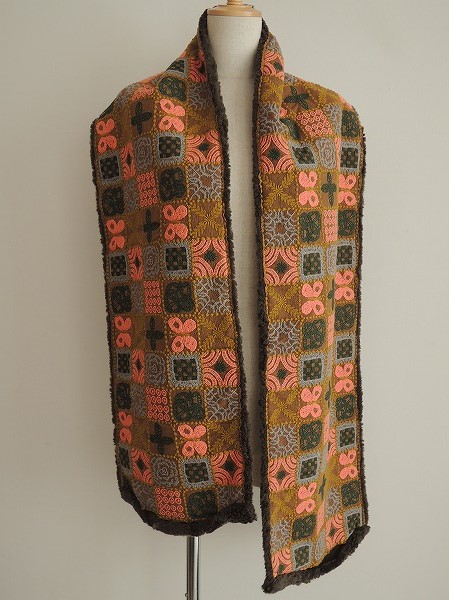 デザイン:mina perhonenのforest tileシリーズの刺繍マフラーです。カラーはこげ茶のボアと、ブラウンのメッシュ地にオレンジピンク×グレーマスタード×ダークグリーンなどの刺繍があしらわれた生地の組み合わせです。