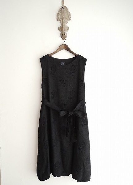 デザイン:mina perhonen 「chum」の刺繍ワンピースです。カラーなブラックで、ピリングあるの素材ベースに濃紺で花の刺繍があしらわれています。左脇下のファスナーで着脱し、両腰にはポケットがあります。裾はバルーンでゴムが通っており、カットオフされた共布の腰ひも付きです。 (掲載写真は、実商品のカラーにできるだけ近づけるよう努力はしておりますが、お使いのモニターや画面設定等によっては、色が異なって見える場合もございますので、予めご了承下さい)