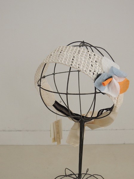 デザイン:mina perhonen×hitomi shinoyamaのヘアアクセです。カラーはアイボリーの格子編みで、サイドにはオレンジ・白・ライトブルー・深緑のmina perhonen「Fabric」のカットオフされた生地で作ったお花があしらわれています。バック部分は内にゴムが施され、グログランテープを結ぶデザインです。定価は16,275円です。