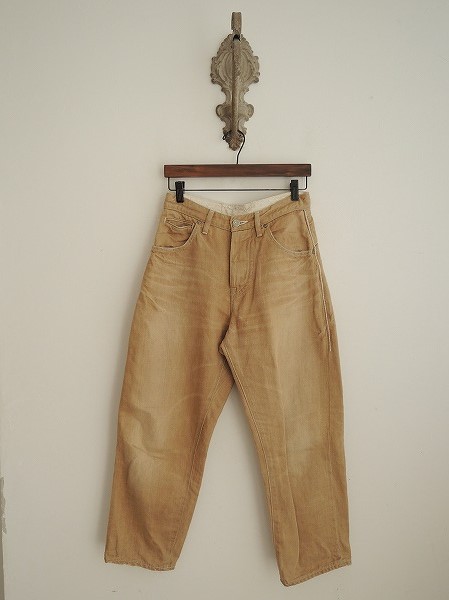 デザイン:mina perhonen「always」の綿麻パンツです。カラーユーズド&ダメージ加工の施されたベージュで、ボタン&比翼ボタンで着脱できます。5ポケットです。 (掲載写真は、実商品のカラーにできるだけ近づけるよう努力はしておりますが、お使いのモニターや画面設定等によっては、色が異なって見える場合もございますので、予めご了承下さい)