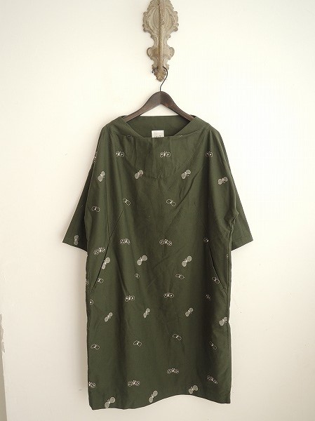 デザイン:ミナペルホネンランドリー「choucho」のワンピースです。カラーは深緑で、白の蝶の刺繍が施されています。フロント両腰にポケットがございます。定価46,200円です。(掲載写真は、実商品のカラーにできるだけ近づけるよう努力はしておりますが、お使いのモニターや画面設定等によっては、色が異なって見える場合もございますので、予めご了承下さい)