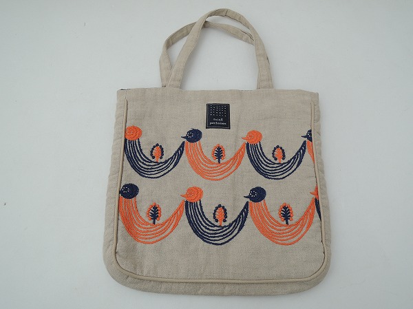 デザイン:mina perhonen 「twitter」のトートバッグです。カラーはグレーベージュで、ネイビー&オレンジの刺繍があしらわれており、サイド周りはグレーベージュのスエード風の合皮のパイピングが施されております。内側はネイビーの別地に切替られ、ポケットが1つ付いております。素材は表地が麻100%、刺繍&裏地が綿100%です。