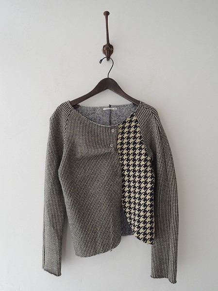 デザイン:mina perhonen 「mom&me」のカーディガンです。カラーはネイビー×ベージュの千鳥格子柄で、毛羽のあるニット素材です。フロントスナップボタン開閉で、生地端は裁ち切りになっております。前後身頃共左右の裾がアシンメトリーデザインになっており、フロント左身頃は大柄千鳥格子で切り替えが施されております。(掲載写真は、実商品のカラーにできるだけ近づけるよう努力はしておりますが、お使いのモニターや画面設定等によっては、色が異なって見える場合もございますので、予めご了承下さい)