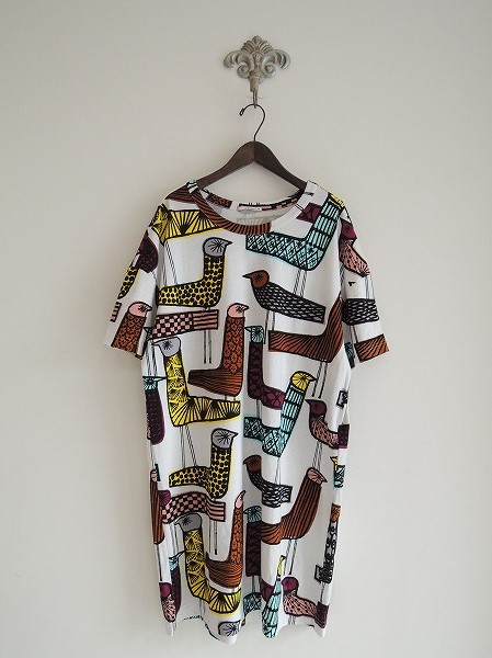 デザイン:mina perhonen「mingling」のワンピースです。カラーはホワイトベースに、色鮮やかな鳥のプリントが施されています。裏地はなく、定価16,800円です。(掲載写真は、実商品のカラーにできるだけ近づけるよう努力はしておりますが、お使いのモニターや画面設定等によっては、色が異なって見える場合もございますので、予めご了承下さい)