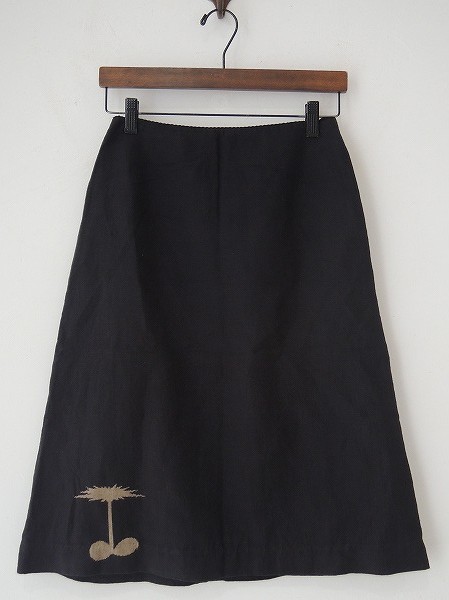 デザイン:mina perhonen「happiness」の台形スカートです。カラーは褪せた黒で、フロント右裾にベージュのお花が施されています。左腰 フック&ファスナーで着脱でき、裏地付きです。(掲載写真は、実商品のカラーにできるだけ近づけるよう努力はしておりますが、お使いのモニターや画面設定等によっては、色が異なって見える場合もございますので、予めご了承下さい)
