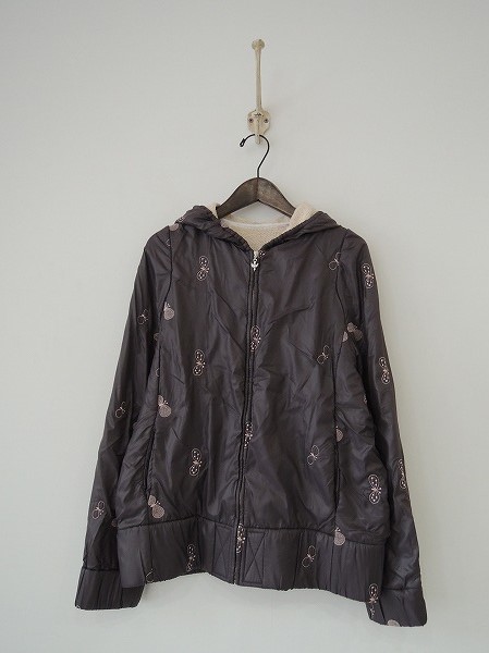 デザイン:mina perhonen 「choucho」のフード付きジップアップブルゾンです。カラーはダークグレーでピンクの刺繍が施されており、内側は裏毛スウェットで表面にナイロン地が施された二枚仕立てであしらわれております。フード周り・袖口・裾はゴム入りで、フロントはジップアップ仕様になっております。両腰にシームポケット付きです。(掲載写真は、実商品のカラーにできるだけ近づけるよう努力はしておりますが、お使いのモニターや画面設定等によっては、色が異なって見える場合もございますので、予めご了承下さい)