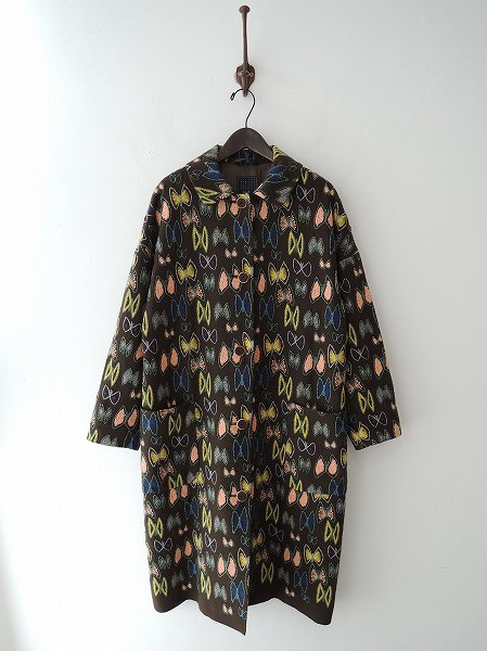 デザイン:mina perhonen 「sky flower」のカシミヤ混ロングコートです。カラーはダークブラウンで、グレー・イエロー・サーモンピンク・ブルー・くすみがかったグリーンでチョウチョの刺繍が全面に施されております。フロントボタン開閉で着脱でき、両腰にパッチポケット付きです。(掲載写真は、実商品のカラーにできるだけ近づけるよう努力はしておりますが、お使いのモニターや画面設定等によっては、色が異なって見える場合もございますので、予めご了承下さい)