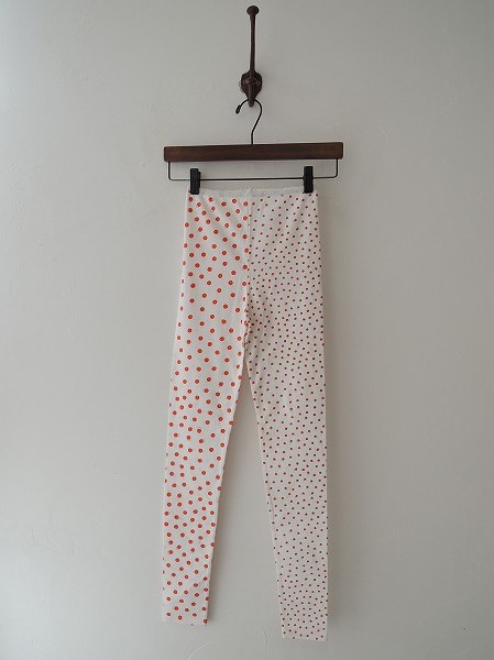 デザイン:mina perhonen 「squall」のプリントレギンスです。カラーはオフホワイトで、濃オレンジのドット、グレーのサークルプリントがあしらわれております。ウエスト部はシルバーのラメ入りの総ゴムに切替えられております。(掲載写真は、実商品のカラーにできるだけ近づけるよう努力はしておりますが、お使いのモニターや画面設定等によっては、色が異なって見える場合もございますので、予めご了承下さい)