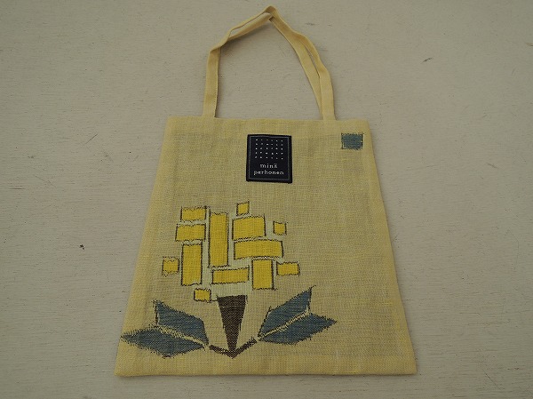 デザイン:mina perhonenのtanpopoシリーズのミニバッグです。カラーは少しくすんだ淡いイエロー地に、イエロー・ブルー・ブラックでたんぽぽのお花の 模様が描かれたデザインで、内側には少し光沢のあるグリーン系の裏地が付いています。素材は表地が麻54%、絹46% 裏地がポリエステル100%です。