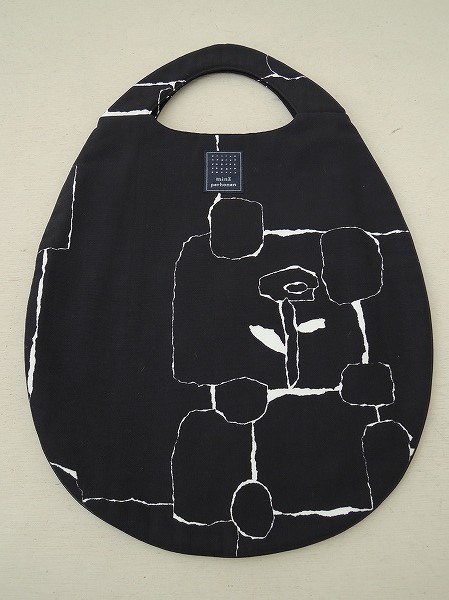 デザイン:mina perhonenのundiscoveredシリーズのエッグバッグです。カラーはブラック地にオフホワイトでお花等が描かれたデザインで、パイピングはブラックの合皮です。内側には光沢のあるブラックの裏地が付いており、素材は表生地が綿100%、裏生地がポリエステル100%です。