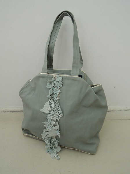 デザイン:mina perhonenのforest paradeシリーズのcanele bagです。カラーは少しグレーがかった淡い感じのライトグリーンで、ライトブルーの蝶々・小鳥・お花の繊細な刺繍レースがあしらわれています。パイピングはアイボリーの合皮で、開口部はマグネットです。内側にはくすんだグリーン系の裏地付きで、ポケットが内に1つあります。素材は表生地・刺繍部分は綿100%で、裏生地は麻100%です。