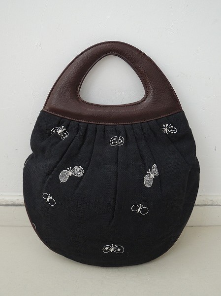 デザイン:mina perhonenのchouchoシリーズのシェルバッグです。カラーは濃紺の模様織り生地に、オフホワイトで蝶の刺繍があしらわれたデザインで、持ち手・サイドから底にかけてブラウンのレザーが使用されています。開口部はマグネットボタンで、内側にはブラックの裏地とポケットが1つ付いています。素材は表生地がリネン55%、絹45% 刺繍糸は綿100% 裏生地はリネン100% 革部分は牛革です。