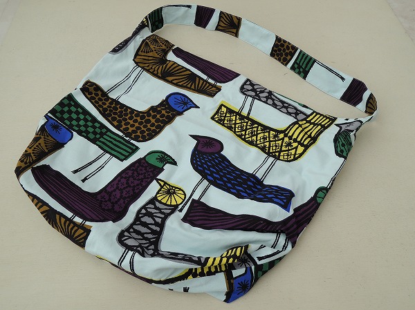 デザイン:mina perhonen 「mingling」のボディバッグ大です。カラーはライトブルーベースで、グレー・イエロー・・ブラウン・パープルなどでカラフルな鳥のプリントが全面に施されています。開口部はジッパー仕様で、ハンドバッグ用の持ち手が付いており、2wayでご使用頂けるデザインです。内側はベージュの別地に切替られ、ポケットが1つ付いております。素材は表地&裏地共に綿100%です。