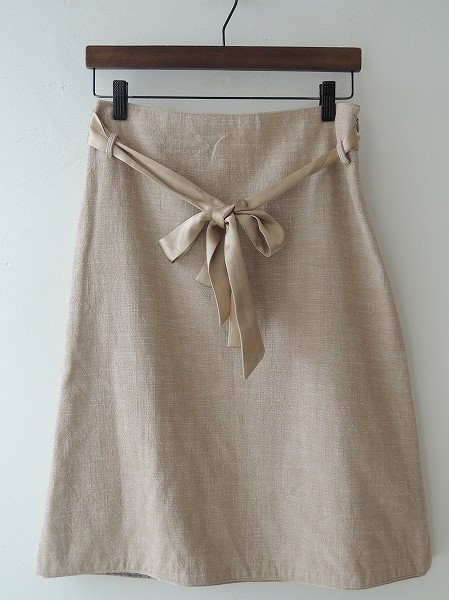 デザイン:mina perhonen 「calm」のシルク混台形スカートです。カラーは白×ゴールドベージュのミックスカラーで、やや薄手の生地であしらわれております。左腰のホック&ジッパーで着脱でき、ウエストリボン&裏地付きです。(掲載写真は、実商品のカラーにできるだけ近づけるよう努力はしておりますが、お使いのモニターや画面設定等によっては、色が異なって見える場合もございますので、予めご了承下さい)