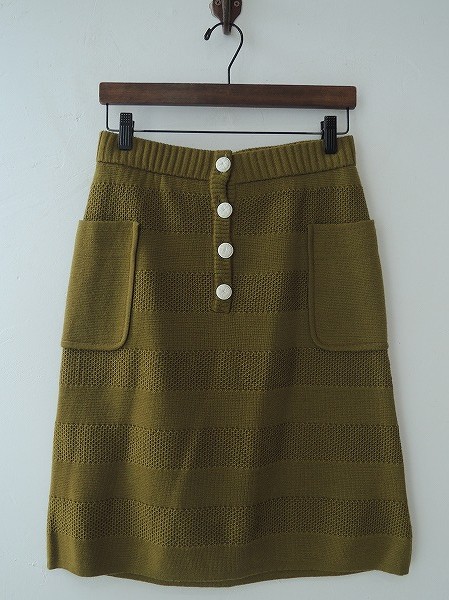 デザイン:mina perhonen「 nostalgia」のニットスカートです。カラーはライトカーキで、ニット素材であしらわれております。ウエストゴムで、フロント半開ボタンで着脱できます。両腰ポケット付きで、裏地はございません。 (掲載写真は、実商品のカラーにできるだけ近づけるよう努力はしておりますが、お使いのモニターや画面設定等によっては、色が異なって見える場合もございますので、予めご了承下さい)