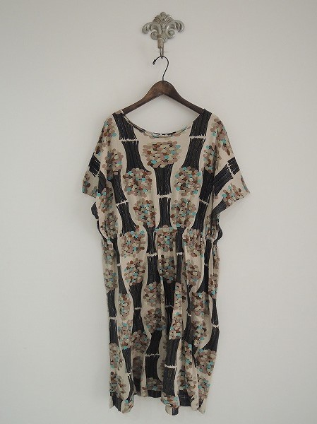デザイン:mina perhonenの「merci」綿ワンピースです。カラーは薄いベージュ地に濃淡紺・暗いカーキ・水色などの総柄です。前ウエスト中央にタックがとられ、両腰からバックにかけてゴムが入っております。定価は29,400円です。 (掲載写真は、実商品のカラーにできるだけ近づけるよう努力はしておりますが、お使いのモニターや画面設定等によっては、色が異なって見える場合もございますので、予めご了承下さい)