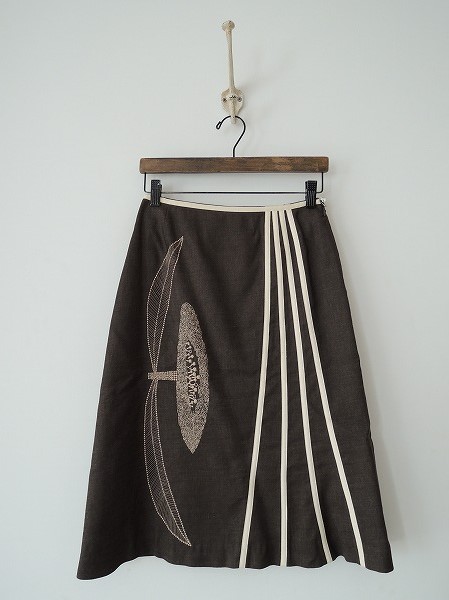 デザイン:mina perhonen「moon flower」のスカートです。カラーはこげ茶で、飾りテープや刺繍が施されています。左腰フック&ファスナーで着脱でき、裏地付きです。定価36,000円です。 (掲載写真は、実商品のカラーにできるだけ近づけるよう努力はしておりますが、お使いのモニターや画面設定等によっては、色が異なって見える場合もございますので、予めご了承下さい)