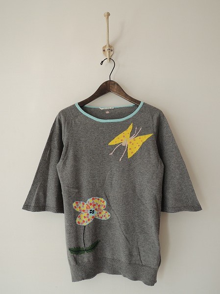 デザイン:mina perhonen 「wonder girl」のベルスリーブニットカットソーです。カラーはミックスグレーでイエロー・ピンク系・ゴールドのチョウチョ&サックス・レッド・ピンクイエローの花柄編みの薄手ニット地であしらわれております。袖丈は5分くらいのデザインです。(掲載写真は、実商品のカラーにできるだけ近づけるよう努力はしておりますが、お使いのモニターや画面設定等によっては、色が異なって見える場合もございますので、予めご了承下さい)