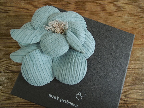 デザイン:mina perhonenのpetalシリーズのコサージュです。カラーは少しくすみのある薄水色で、中央部分には淡いピンクの軸があしらわれたデザインで、張りのある肌触りです。