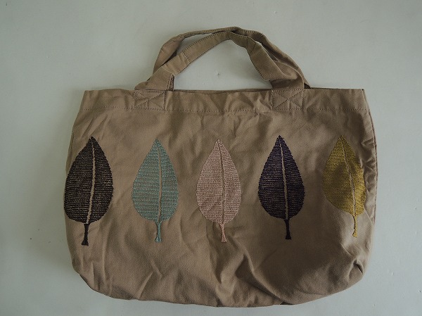 デザイン:mina perhonenのhappaシリーズのパニーニバッグです。カラーはライトブラウン地に淡いピンク・水色・ブラウン・パープルマスタードで葉っぱの刺繍が施されており、開口部にはピンクで蝶々の刺繍が施された小豆がかったブラウンの被せが付いています。内側にはポケットが2つ付いており、素材は表生地がキュプラ59%・綿41%、刺繍部分と裏生地が綿100%です。