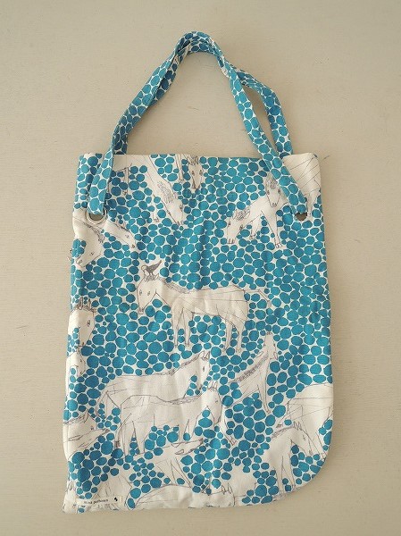 デザイン:mina perhonenのoasisシリーズの変形トートバッグです。カラーはオフホワイト地にグリーンブルー・褪せたグレーで、水玉と馬が描かれており、開口部はファスナーです。内側にはライトグレーの裏地とポケットが付いており、サイドのファスナー部分からも中の荷物を出し入れして頂けるデザインです。素材は表地が綿70%・麻30%、裏地が綿100%です。