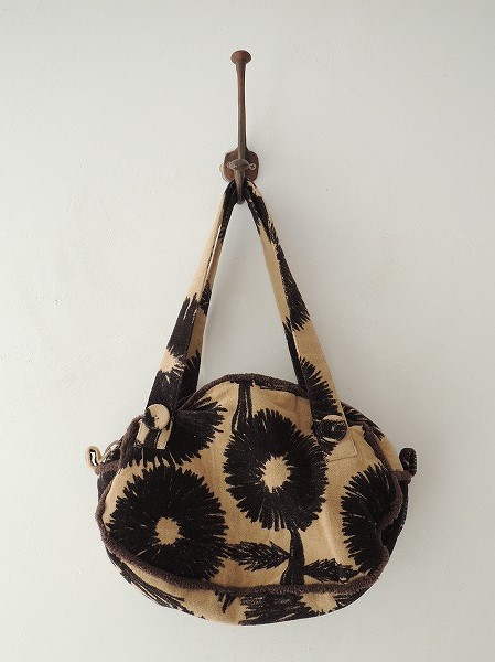 デザイン:mina perhonenのdaisyシリーズのクラウドバッグです。カラーはブラウンベージュ×チャコールブラウンで、、パイピングにはこげ茶の毛足の長いパイル素材があしらわれています。開口部はファスナー仕様で、内側にはくすんだピンクベージュの裏地にポケットが2つございます。素材は表生地・裏生地共に綿100%です。
