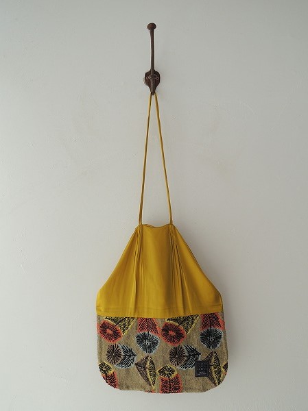 デザイン:mina perhonenのhana no miシリーズのfondant bagです。カラーはグレー×山吹のミックス織りベースにくすんだイエロー×ブラック×水色×赤みのあるオレンジなどで刺繍があしらわれた生地&光沢のあるグレーマスタードの組み合わせです。開口部は巾着で、素材は麻64%、毛36% 刺繍部分は綿60%、アクリル24%、毛16%で、定価は11,550円です。