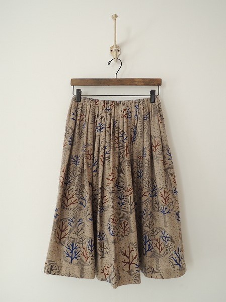 デザイン:mina perhonen 「grove」のフレアスカートです。カラーは薄茶ベースにブラウン・ブルー・グレーの総柄で、左サイドジッパー、裏地付きです。(掲載写真は、実商品のカラーにできるだけ近づけるよう努力はしておりますが、お使いのモニターや画面設定等によっては、色が異なって見える場合もございますので、予めご了承下さい)