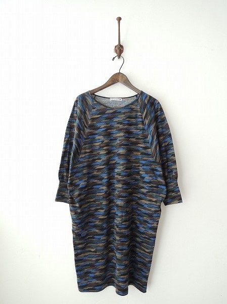 デザイン:mina perhonen 「autumn breeze」のドルマンスリーブワンピースです。カラーはブルー・ネイビー・カーキ系・ブラウンなどで、総柄プリントの薄手生地であしらわれております。袖丈は八分くらい、定価25,200円の商品です。(掲載写真は、実商品のカラーにできるだけ近づけるよう努力はしておりますが、お使いのモニターや画面設定等によっては、色が異なって見える場合もございますので、予めご了承下さい)