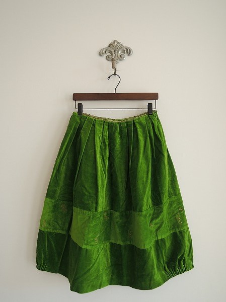 デザイン:mina perhonen 「choucho」のベルベットスカートです。カラーはライトグリーンでベルベット地であしらわれており、サーモンピンクでチョウチョの刺繍が施されております。ウエストはタック入りで、両裾のみゴム入りです。左腰のフック&ファスナーで着脱できます。(掲載写真は、実商品のカラーにできるだけ近づけるよう努力はしておりますが、お使いのモニターや画面設定等によっては、色が異なって見える場合もございますので、予めご了承下さい)