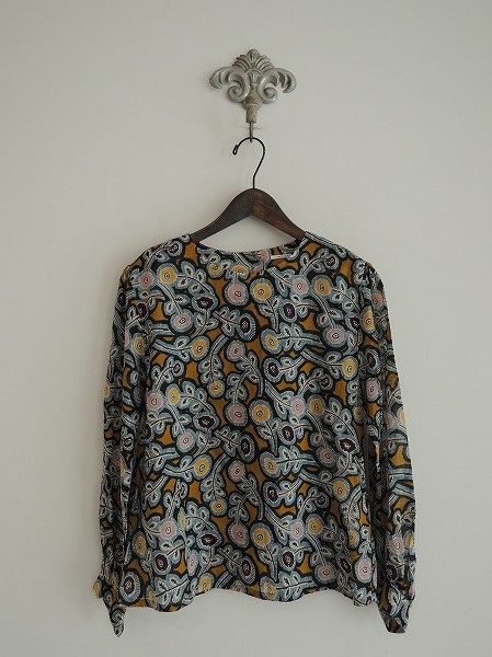 デザイン:mina perhonen 「Hanna」のプリントシャツです。カラーはマスタードベースで、ブラック・パープル・ピンク・くすみがかったライトブルーなどの総柄プリントのガーゼ生地であしらわれております。背上部はタック入りで、バック襟元は生地を寄せてボタン留めで着用するデザインです。(掲載写真は、実商品のカラーにできるだけ近づけるよう努力はしておりますが、お使いのモニターや画面設定等によっては、色が異なって見える場合もございますので、予めご了承下さい)