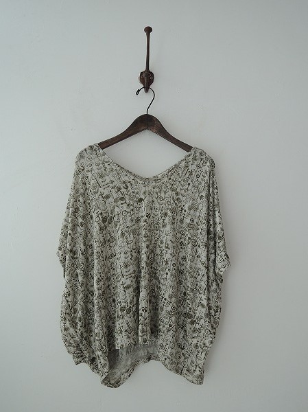 デザイン:mina perhonen 「letter of flower」のドルマン風カットソーです。カラーはライトグレー×モスグリーンで、総柄プリントの薄手ニット地であしらわれております。袖丈は5分くらい、両Vネックデザインです。(掲載写真は、実商品のカラーにできるだけ近づけるよう努力はしておりますが、お使いのモニターや画面設定等によっては、色が異なって見える場合もございますので、予めご了承下さい)