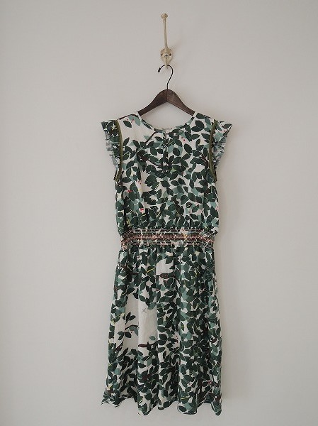 デザイン:mina perhonen「nap」のワンピースです。カラーはホワイトベースに、グリーン系のリーフ柄がプリントされた、やや薄手の素材です。フロントボタンで、肩にはフリルがあしらわれ、ウエストにはスモッキング刺繍が施されています。裏地付きで、定価は54,600円です。(掲載写真は、実商品のカラーにできるだけ近づけるよう努力はしておりますが、お使いのモニターや画面設定等によっては、色が異なって見える場合もございますので、予めご了承下さい)