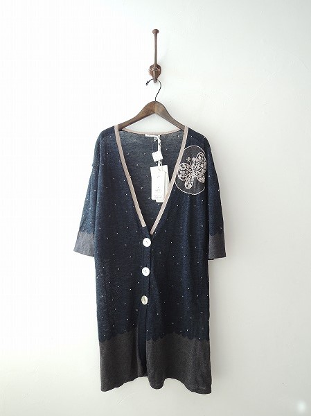 デザイン:mina perhonen 「forest wing」のニットロングカーディガンです。ベースは濃ネイビー×濃グレーで薄手ニット地であしらわれており、ライトグレーの刺繍、襟元はモカベージュのリブに切り替えられております。袖丈は7分くらい、肩部分には装飾用のシェルボタンがあしらわれております。定価58,800円の商品です。(掲載写真は、実商品のカラーにできるだけ近づけるよう努力はしておりますが、お使いのモニターや画面設定等によっては、色が異なって見える場合もございますので、予めご了承下さい)