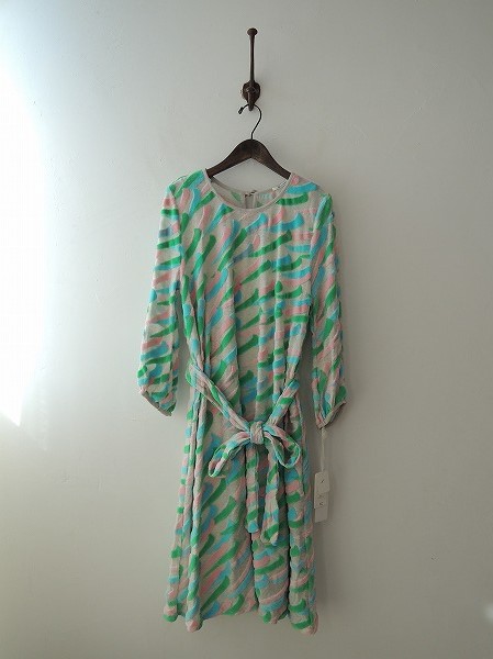 デザイン:mina perhonen 「windie」のストール付きワンピースです。ベースはライトグレーのやや透け感のある薄手ニット地で、ライトグリーン・ピンク・ライトブルーのパイル刺繍が全面に施されております。背上部にひも付きのスリット入りで、別途共布の細ストール&キャミソールワンピースのペチコートが付属されております。定価37,800円の商品です。(掲載写真は、実商品のカラーにできるだけ近づけるよう努力はしておりますが、お使いのモニターや画面設定等によっては、色が異なって見える場合もございますので、予めご了承下さい)