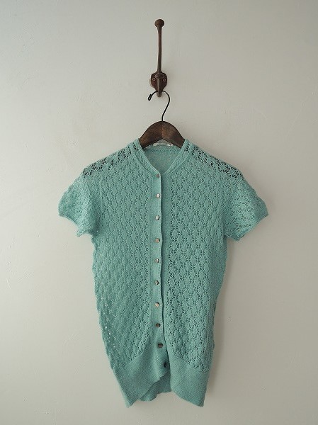 デザイン:mina perhonen 「meringue」のニットカーディガンです。カラーはライトブルーで、透かし編みの薄手ニットであしらわれております。(掲載写真は、実商品のカラーにできるだけ近づけるよう努力はしておりますが、お使いのモニターや画面設定等によっては、色が異なって見える場合もございますので、予めご了承下さい)